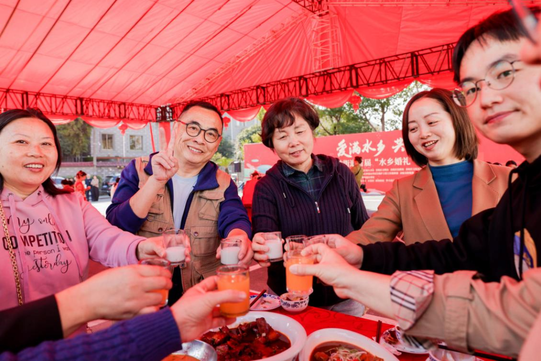 喜船靠岸后,新人们行至本次活动的主会场。揭红盖头、签署婚书、行宋式“合卺”之礼…传统文化赋予婚嫁独特的魅力,而“水乡婚礼”作为梦溪水乡民俗风情一块极为重要的内容,保护和传承意义重大。