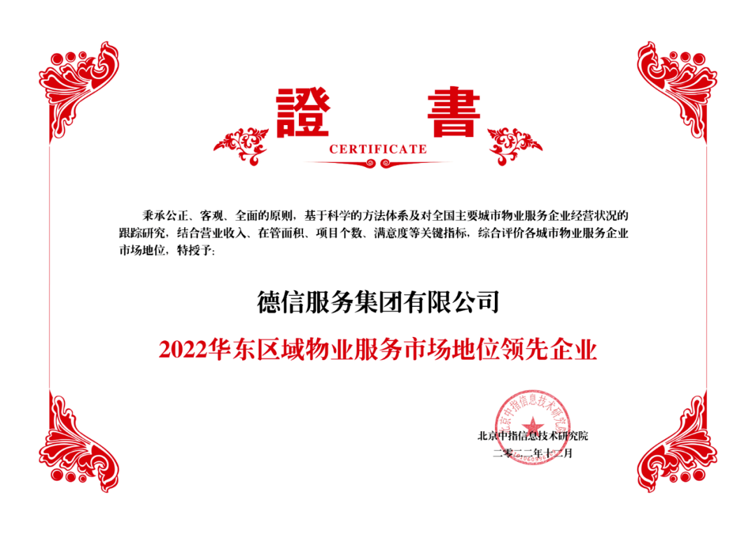 12月7日,“2022中国房地产大数据年会暨2023中国房地产市场趋势报告会”隆重召开。本次报告由中国指数研究院发布,德信服务凭借专业化品质服务以其在华东区域的卓越表现,荣膺“2022华东区域物业服务市场地位领先企业”,位列第15位。