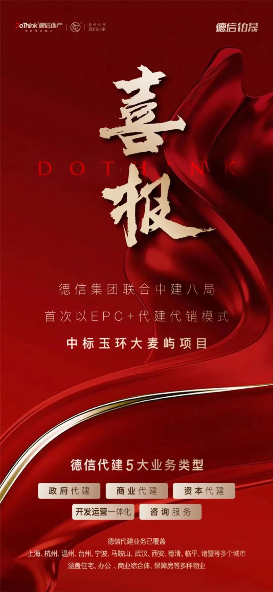 近日,德信集团联合中建八局,首次以EPC+代建代销模式中标玉环大麦屿项目。德信代建主要包含政府代建、商业代建、资本代建、开发运营一体化、咨询服务五大业务类型。目前已覆盖上海、杭州、温州、台州、宁波、马鞍山、武汉、西安、德清、临平、诸暨等多个城市,涵盖住宅、办公、商业综合体、保障房等多种物业。德信集团积极布局代建业务,也为企业探索新发展模式提供了一个方向。今后,德信集团将携手合作伙伴,共建美好生活、打造理想家园。